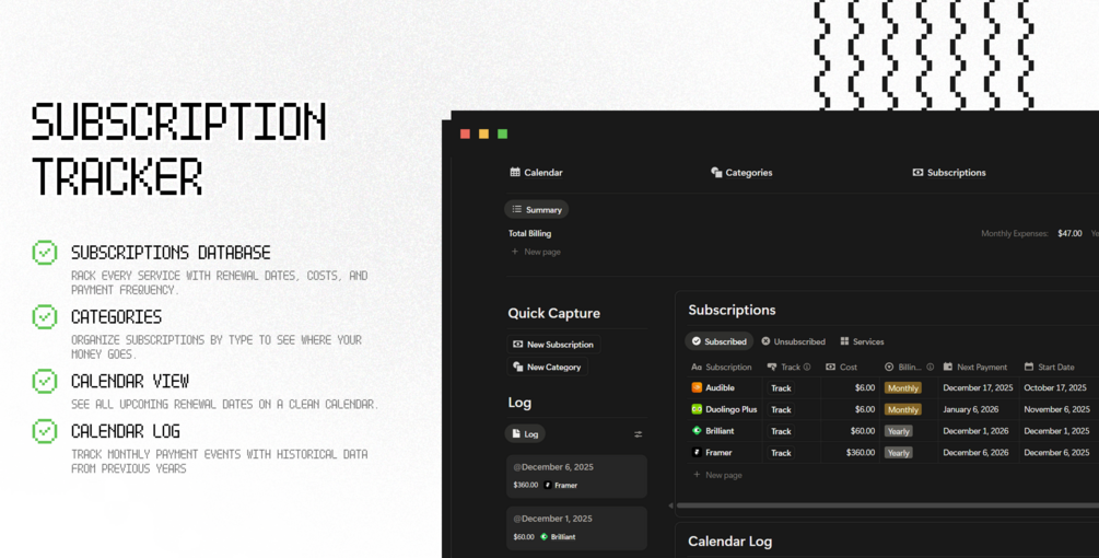 - Subscriptions Database: A central hub for tracking every service, including renewal dates, costs, and payment frequency.